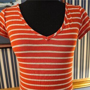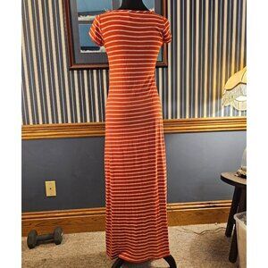 Striped, dark orange and white lightweight jersey comfort summer dress in size S. Made of Polyester, Rayon, and spandex, this lounge dress ensures cool everyday comfort.