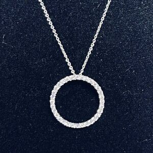 This Epiphany circle pendant necklace exudes timeless elegance with its sterling silver and Diamonique cubic zirconia. Reminiscent of vintage treasures, the circle pendant symbolizes eternity, making it a meaningful gift or addition to your jewelry collection. Its intricate design and sparkling stones capture the charm and allure of a bygone era. The pendant is stamped JCM 925 CZ China. the necklace is stamped JCM Italy 925. JCM stands for Jacmel.