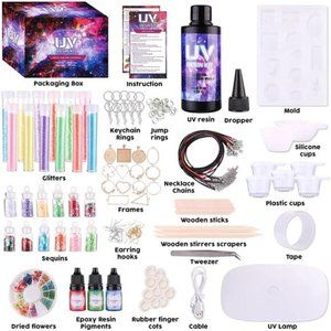 🧿✨【ALL IN ONE PACKAGE WITH UV LAMP】With everything that is needed including earring hooks, sequin, rubber finger cot, dried flowers, tweezer, glitters, keychain rings, necklace chains, jump rings, UV lamp, UV resin, dropper, colors epoxy resin pigment, frames, tape, mold, plastic and silicone cups, wooden stirrers scraper and sticks and instructions.