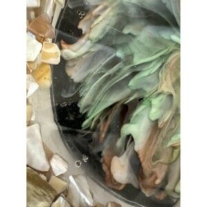 This epoxy resin jewelry holder is a stunning addition to any collection. The intricate design features a blooming flower in the center, surrounded by shells and a colorful resin base. Handmade by Southern Sista Designs in the United States, this piece is a unique and beautiful. With its multicolor design and handmade aspect, it's sure to be a standout piece in any collection.