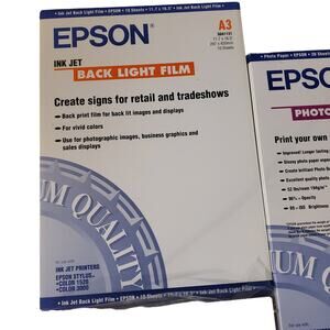 Epson Photo Paper 10" x 17" Back Light Film 11.7" x 16.5" Matte Paper 11" x 14" Lot. Paper was preowned and in very good clean condition. There's about 6 pages of epson 11.7in x 16.5in ink jet back light film. There's about 3 pages of epson 11in x 17in photo paper. There's about 18 pages of epson 8in x 10in/11 x 14in matte heavyweight paper. View all pictures before purchasing. Item will be packed with care. Message me if you have any questions. Browse and save my store for antique and vintage collectibles. Reasonable offers are considered.