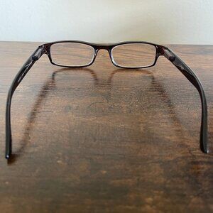 These Equate Phoenix BWN brown rectangle eyeglass frames are pre-owned and in good condition. The frames show light cosmetic wear from normal use, including faint scuffs along the arms and edges, but no cracks or structural damage. The hinges are intact and open and close smoothly. Overall, these stylish brown rectangle frames remain durable and ready for everyday wear.