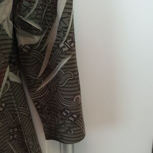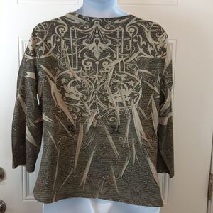 Equation olive green printed 3/4 sleeve blouse, with decorative buttons at neckline.