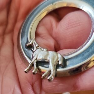 Preowned. Good condition. No excessive use or wear. Cowboy hat and horse silvertone accents. Circular dangle, pierced earrings with blue accent color.