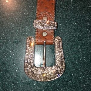 Brown leather with cow hide print and rhinestones. All stones are still in tact. Size Medium.