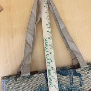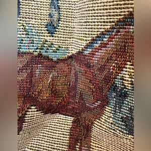 Horse tapestry bag. Front Velcro pocket, back zip pocket, cargo netting on side for additional storage. Attached coin purse and internal zippered compartment
