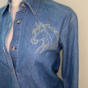Jean denim horse gold silver embellished shirt top button up down small S rodeo western equestrian boho