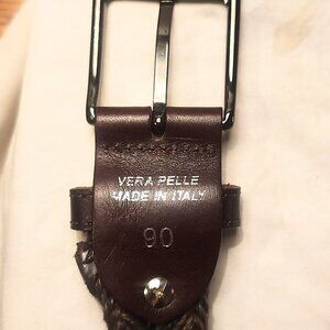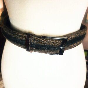 This belt is made from a fabulous equiline woven fabric for stretch and resiiency. Although it is 90 cm long, the buckle is secured anywhere through the weave and it never tears, so it can be adjustable. The leather, buckle, and fabric are in great condition, only worn a few times. One callout: the weave at the buckle end is slightly askew (see photo) but it is not noticeable when it stretches to be worn and does not impact the integrity of the belt.