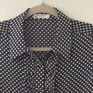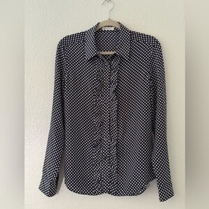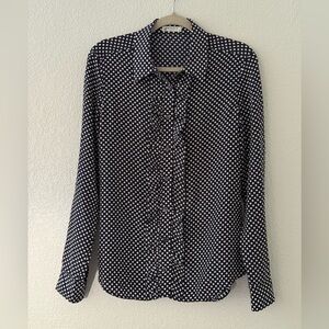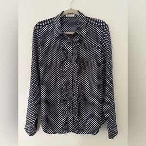 Equipment Blue & White Polka Dot Long Sleeve Front Ruffle Silk Top Size M
