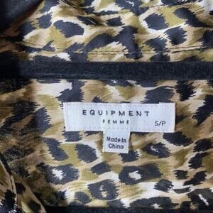 I’n excellent used condition. Equipment "Brett" leopard-printed top. Spread collar; button front. Long sleeves; button cuffs. Relaxed silhouette. Shirttail hem. Polyester.