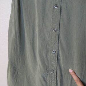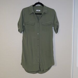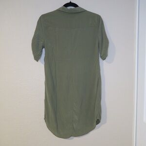 Olive green shirt dress with button-up front by Equipment. Features short sleeves and a relaxed fit. Preloved condition, faint discoloration on the front bottom area and back top area. Please see all pictures.