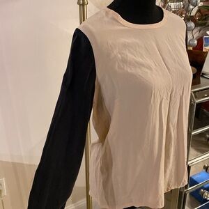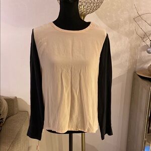 Chic long sleeve top by Equipment. Cream body with black sleeves. Soft and comfortable fabric.
