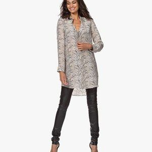 This long version of the iconic Essential blouse from Equipment can be worn as a tunic or as a mini shirt dress. The snake printed silk style comes in a versatile off-white, gray and black color combination and is made of pure silk in a supple quality with a beautiful drape.