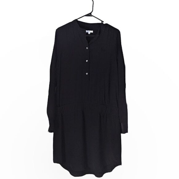 Equipment Femme Long Sleeve Drop Waist Dress in Black Size Medium. In excellent used condition. This classic elegant dress features a button front closure, a mandarin style neckline, long sleeves with buttoned cuffs, an elastic waistband & a rounded hemline. It is a relaxed fit/silhouette. It would pair perfectly with loafers/flats as shown. Only tried on, it fit a little looser than I anticipated.