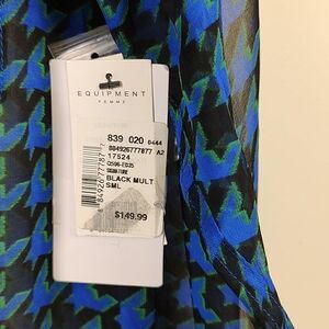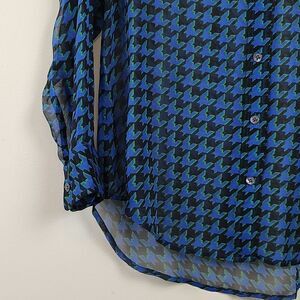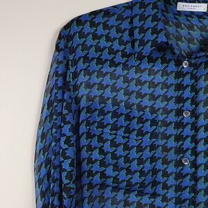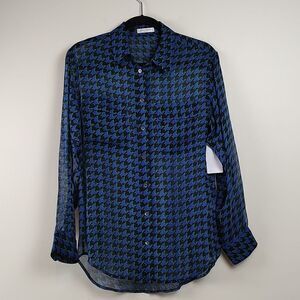 NWT Equipment Femme Semi Sheer Silk Long Sleeve Button Front Blouse in a Blue and Green Houndstooth Pattern. This gorgeous blouse has a collar, 2 chest flap pockets, Equipment Femme branded buttons down the front, and each cuff has 3 branded buttons for rolling the sleeves up. 100% silk. Size Small.