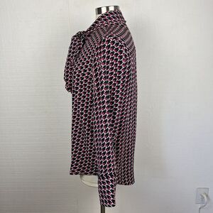 Elevate your wardrobe with this stunning Equipment Femme shirt in size M. The shirt features a classic collared neckline and button-up closure, with a stylish neck tie to add a touch of sophistication. The houndstooth pattern in vibrant red color pairs perfectly with long sleeves, making it suitable for both party/cocktail and business occasions.