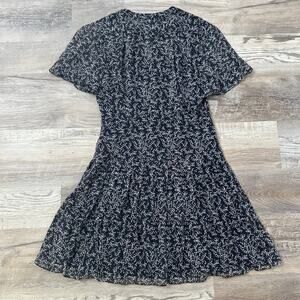 Beautiful silk mini dress by Equipment Femme featuring a navy base with allover white floral print. Tiered skirt, flutter sleeves, and front button detail create a romantic silhouette. Fully lined with side zip.