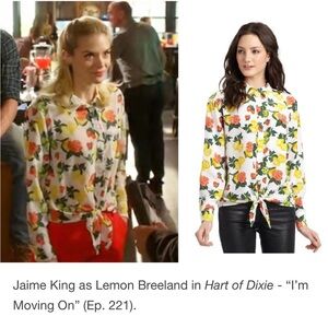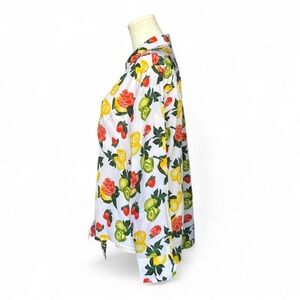Equipment Femme 100% Silk Daddy Tie Fruit Print Shirt. Features a bright fruit print with lemons, limes, strawberries and flowers. The button up front offers a pocket, a tied hem with a relaxed fit, long sleeves and an adjustable 3 button cuff. Dry Clean.