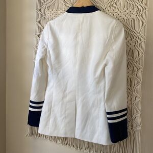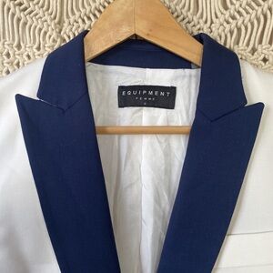 Equipment Femme blazer in a classic white and navy colorway, made from a wool-blend fabric for a polished, sophisticated look. Timeless tailored fit, perfect for workwear or elevated casual styling. Marked as size 2.