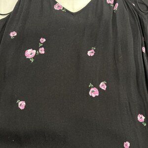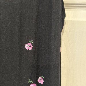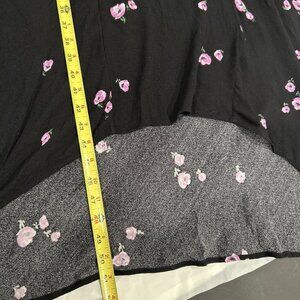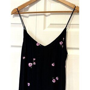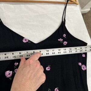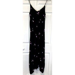 Elegant and lightweight, this Equipment Femme floral maxi slip dress in size L is perfect for elevated everyday wear or vacation styling. Features a deep V-neckline,spaghetti straps, a feminine high-low hem, and a delicate black base with pink rose print throughout. The semi-sheer, unlined design offers a draped silhouette that pairs beautifully with sandals or heels.