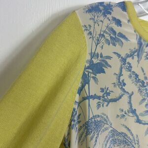 This top sweater features a lightweight design with a bold, contrasting pattern. The main body showcases a botanical-inspired print in shades of blue on a cream background, adding a soft and artistic touch. The sleeves, back and neckline are a bright yellow-green, creating a fresh and vibrant contrast to the muted tones of the print. This piece blends casual and elegant elements, making it versatile for various occasions