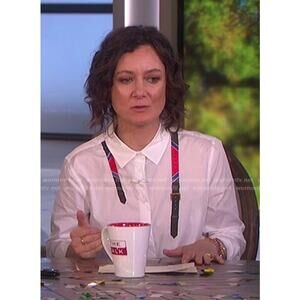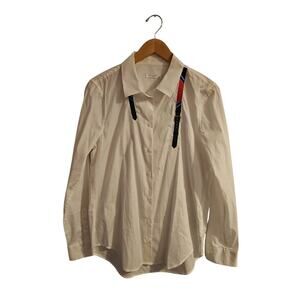 This elegant shirt is crafted with beautiful embroidered details. The comfortable design and flowing fabric create a flattering silhouette. A delicate belt accentuates the neck, adding a touch of sophistication. The crisp white button-down styling offers a timeless appeal. This versatile piece transitions seamlessly from day to evening.