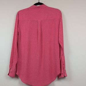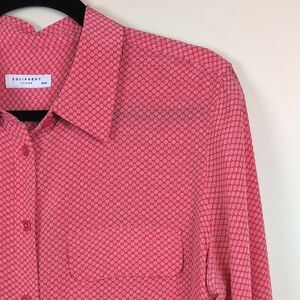Equipment Femme Long Sleeve Button Front Silk Blouse Top in a melon polka dot circles print. This shirt features a classic collar, button front, long sleeves, button cuffs, 2 front chest flap pockets, and a round hem. 100% silk. Size Medium.