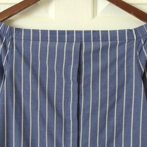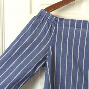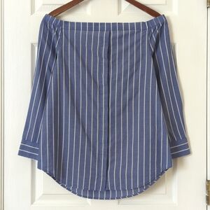 This beautiful top features an off the shoulder silhouette, buttons down the front that are hidden by a placket, long sleeves with buttoned cuffs, and a curved hem. It is blue with white vertical stripes. It is soft, lightweight and breathable with a classic, relaxed fit. Very versatile, flattering, and high quality!