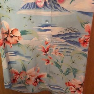 Sky blue ocean print with waves and tropical hibiscus flower print all over / floral birds palm trees Two front bust pockets