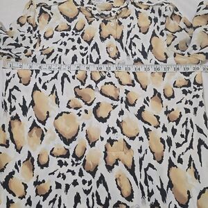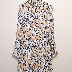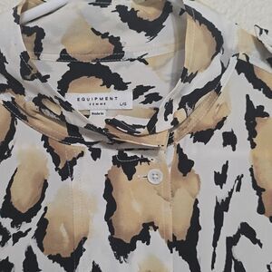 Chic leopard print dress by Equipment. Features a bold black and white pattern with tan accents. Long sleeves and button-up front. Perfect for stylish outings.