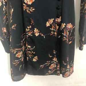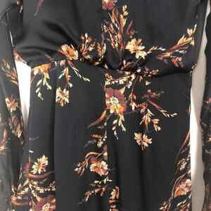 Equipments women's faux wrap floral dress. V-neck. Collared. Long sleeves. Knee Length. Side button down. Ruched cuffs. Lined. Dark blue with orange/cream floral print. In good used condition. No stains, tears or holes.