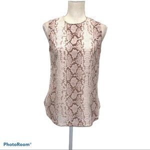 A simple shell silhouette, the Lyle 100% silk tank by Equipment features a high neckline, back zipper closure and rounded, vented hem. Beautiful light color palette, perfect for spring and summer. Size XS