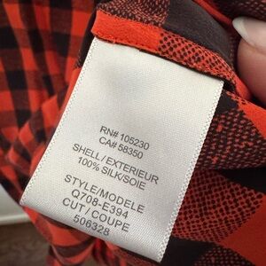 Bold SILK, plaid shirt dress by Equipment. Features striking red and black pattern. Great for holiday parties. Small hole in seem. Easy to mend. Freshly dry cleaned.