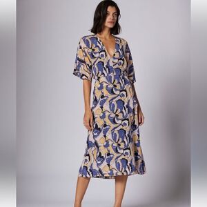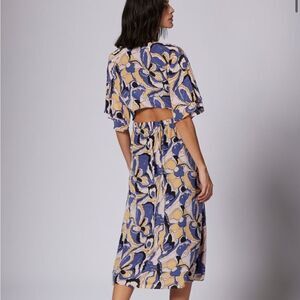 Blue and butter yellow silk midi dress. V neck, flutter sleeves, open back with elastic waist. Fully lined