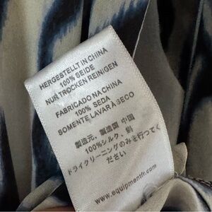 Navy and Marshmallow Cream Leopard Print Silk Button Down Shirt by Equipment. Features a blend of navy blue, white, and cream colors. Also has 2 front pockets.