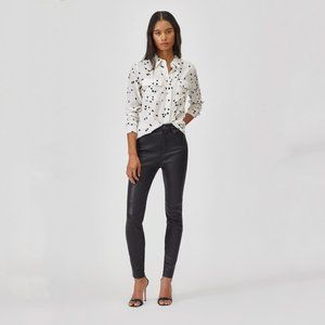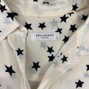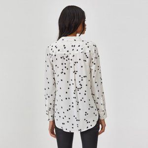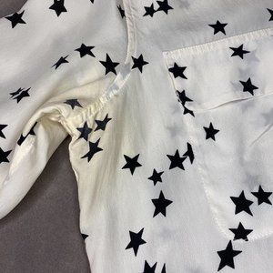 Interesing print in an easy-to-wear black and white combo. Luxurious 100% Silk feels amazing on the skin and will keep you cool as the temperatures rise. Overall good condition with slight staining at pits and inside collar (see photos), but not visible when wearing.