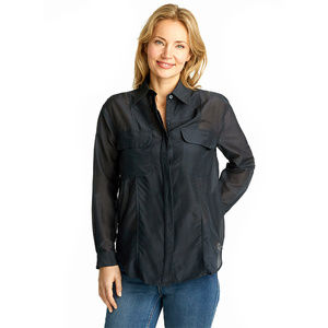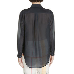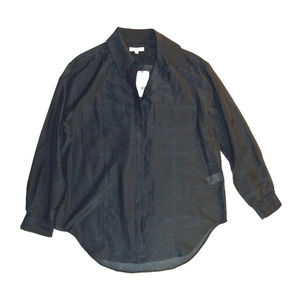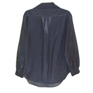 This is a brand new Equipment "Tamsen" blouse. It is a dark blue, bordering on Black. There is a lined panel right down the center of the front, leaving the back and sleeves more sheer. Front button closure with hidden placket, long sleeves with button cuff. Two front flap pockets. Beautifully crafted. 70% cotton, 30% silk. Dry clean. Retail $250, new with tags and spare button. Last 3 photos are stock photos, the rest are of the item you will receive. Please check measurements in photo.