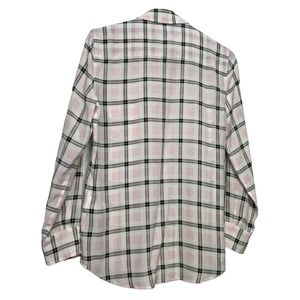 Signature brett silk button down silk blouse. Collared neckline. Light pink and white plaid grid print throughout on white base. Front chest pocket.