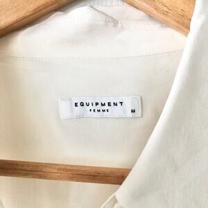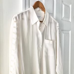 Size medium from Equipment. White silk button down with cut out details going down the sleeve length. Relaxed looser silhouette. Small mark at end of one sleeve cuff and on blouse. See photos. Preowned.