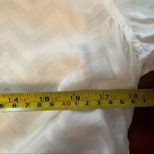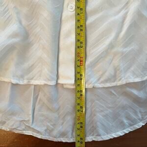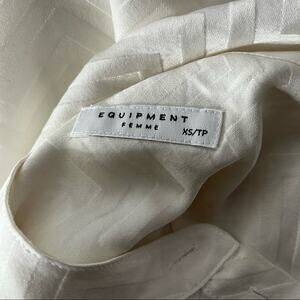 Elegant and timeless, this Equipment Femme blouse is crafted from luxurious silk and designed with a sleek collarless neckline and subtle chevron detail. Long sleeves with button cuffs and a lightweight drape give it a polished, elevated look. Perfect for work, events, or day-to-night styling. Classic white, size XS. Measurements are approximate/flat Preowned used condition equipment femme blouse, silk white top, womens button blouse, collarless silk shirt, chevron blouse, xs silk blouse