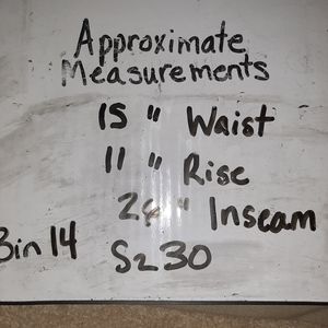 See photos for measurements. Velcro opening at ankle. Some wear on inner thighs.