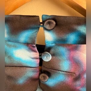 This beautiful swirl of color silk blouse is in overall great condition. There is one tiny discoloration/hole on the left collar. Please see photos for details of this, the fabric, and the measurements.