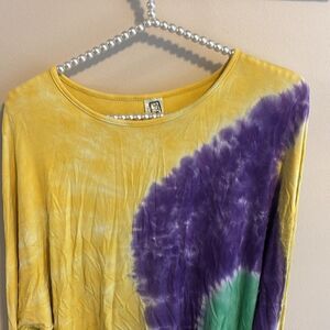 Vibrant yellow and purple tie-dye long sleeve top with a touch of green. Perfect for a casual look.