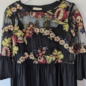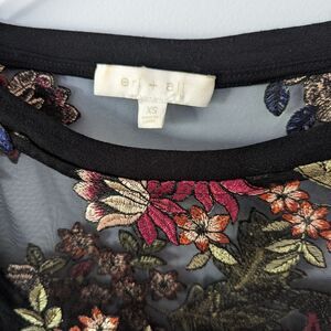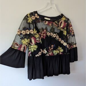 Eri + Ali Anthropologie Black Sheer Floral Embroidered Peplum Top XS