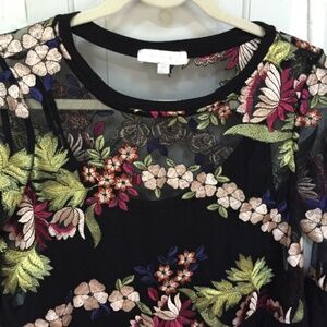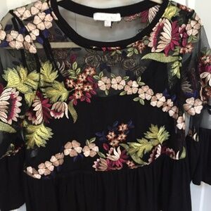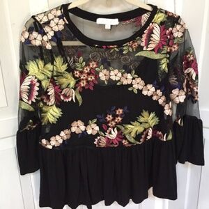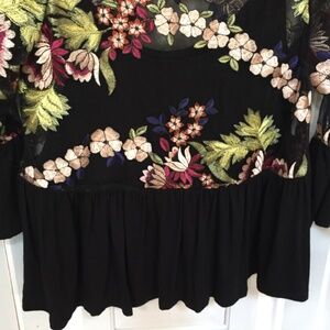 Elegant Eri + Ali lined black blouse with attached tank and vibrant floral embroidery. Features sheer sleeves and top front and a peplum hem. Perfect for stylish occasions.