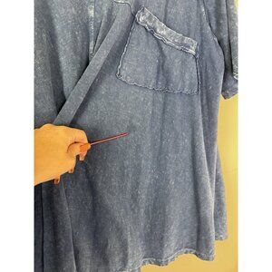 With a pit-to-pit measurement of 25" (63.5 cm) and a length ranging from 26" to 29" (66–74 cm), it offers a relaxed fit with soft stretch, short sleeves, and a roomy pocket that adds both function and shape. The hem falls with natural asymmetry, perfect for pairing with linen trousers, wide-leg pants, or layered over slip dresses for an artsy, undone vibe.