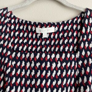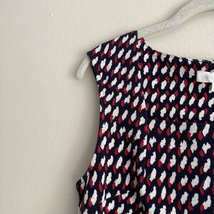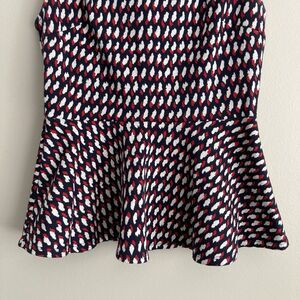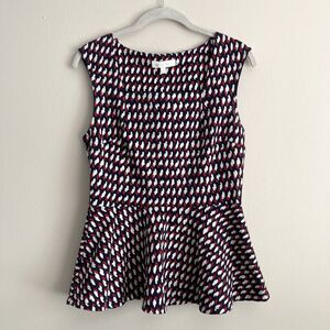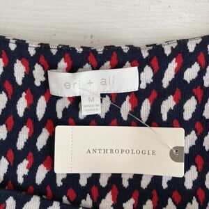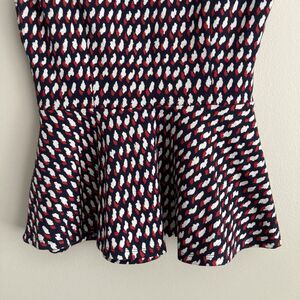 Eri + Ali Womens Medium Effie Peplum Blouse Square Neck Ponte Knit Top Cottage. Eri + Ali women's Effie peplum top. Sleeveless. Square neck. Peplum. Knit. Cotton and spandex fabric. Navy, red and white pattern. Size medium. Measured laying flat: measures 16.25" from pit to pit, 22.5" long from top of tag to hem. New with tags.
