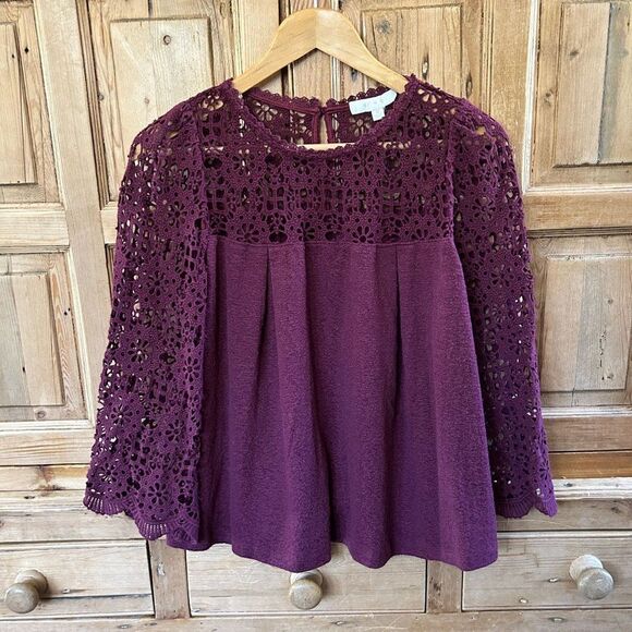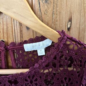 Eri+Ali Medium Shirt Maroon Red Floral 3/4 Sleeve Lace Crewneck Button Anthro