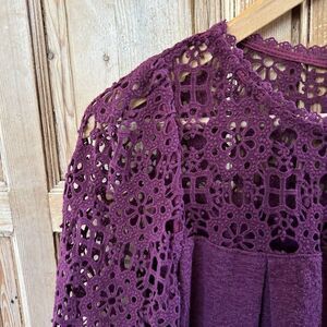 Features: Super cute maroon/plum lace blouse. Crewneck. Floral lace neckline and sleeves. Button closure at top of neckline. Two pleaded points in front.