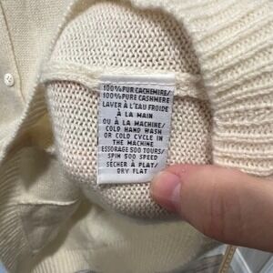 Keywords: cashmere, luxury knitwear, v-neck, button up, cream knit, classic, wardrobe staple, elegant, soft, cozy, layering piece, designer knit